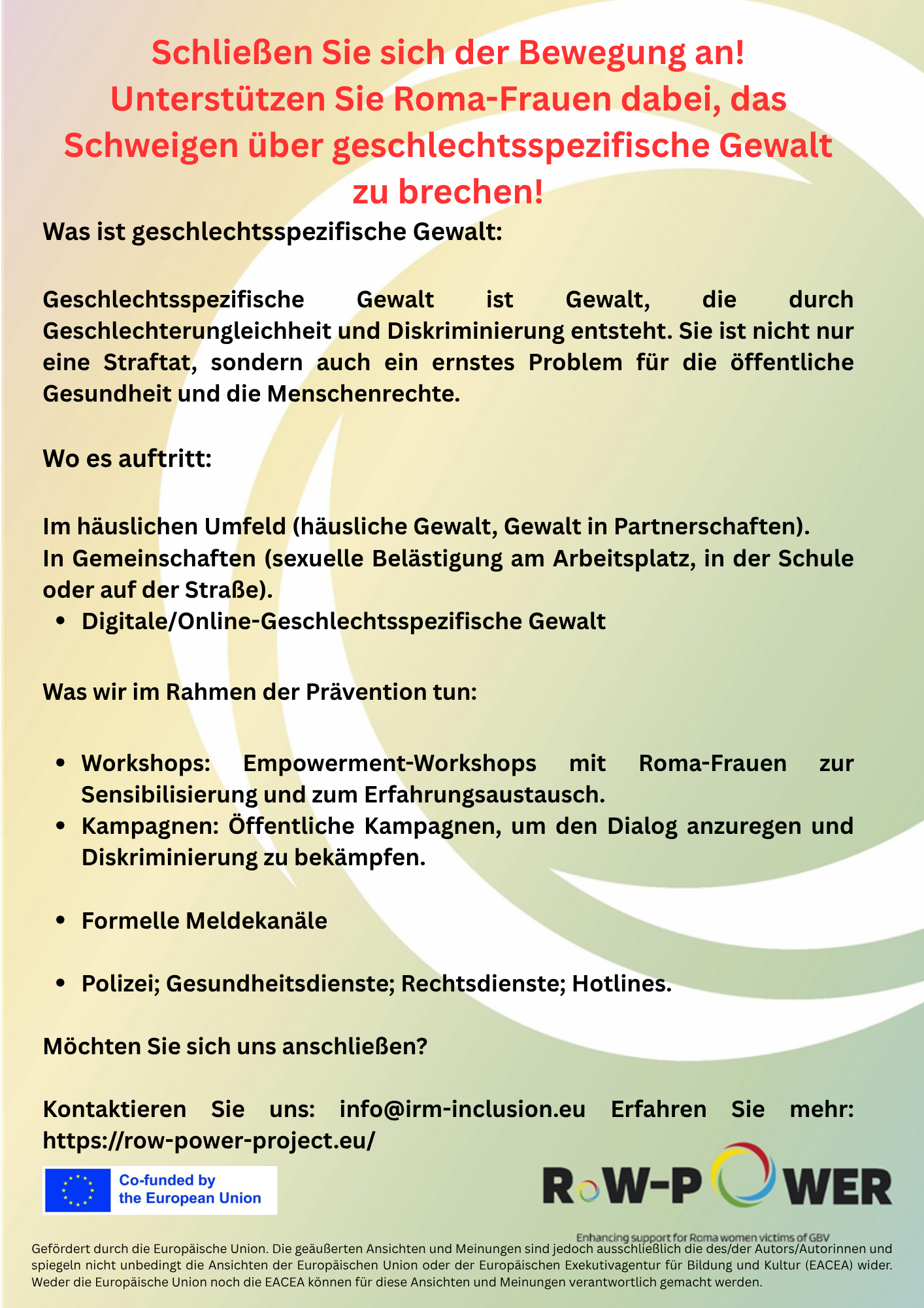 Das Projekt RoW-Power zielt darauf ab, die Fähigkeiten und Kapazitäten von Roma-Mediatoren und Fachleuten für geschlechtsspezifische Gewalt (GBV) zu verbessern. Das RoW-Power-Projekt besteht aus einem Team von sieben Organisationen aus Deutschland, Griechenland, Nordmazedonien, Spanien, Rumänien, der Slowakei und Irland. Das Projekt, das vom Erasmus+ Programm der Europäischen Union kofinanziert wird, begann im September 2023 und hat eine Laufzeit von 24 Monaten, die im August 2025 endet. Zu unseren Schwerpunkten gehören die Vermittlung von Roma-Frauen an geeignete GBV-Unterstützungsdienste, die Förderung des kulturellen Verständnisses, die Verbesserung der Unterstützungsdienste und die Verbesserung der Zusammenarbeit zwischen Fachleuten. Zu diesem Zweck bietet das RoW-Power-Projekt Leitlinien, ein Programm zum Aufbau von Kapazitäten und Sensibilisierungskampagnen für Fachkräfte, die innerhalb der Roma-Gemeinschaft eingesetzt werden. Auf diese Weise sollen Fachkräfte befähigt und positive Veränderungen im Leben von Roma-Frauen, die von GBV betroffen sind, herbeigeführt werden.